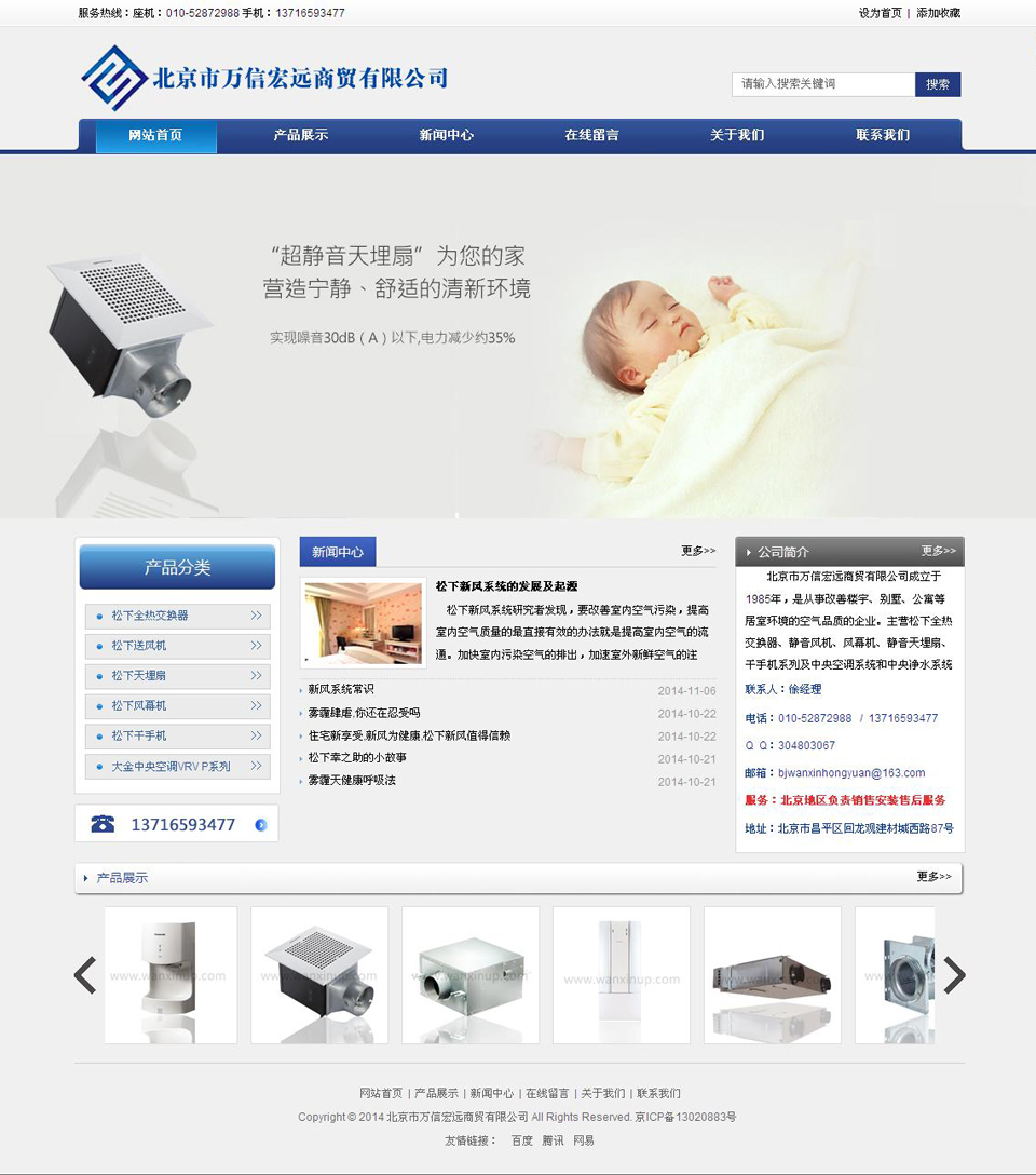 北京市万信宏远商贸有限公司成立于1985年,是从事改善楼宇、别墅、公寓等居室环境的空气品质,专业经销室内通风设备的企业。