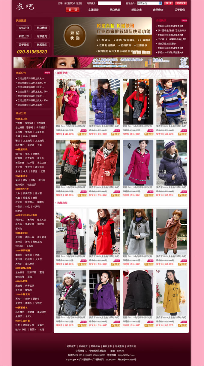 项目名称:衣吧网网站制作签定日期:2010年1月18日制作要求:网站采用PHP语言,mysql数据库,网站主要栏目包括:首页、实体进货、网店代销、新款上市、定单查询、关于我们等等,网站带有会员注册及购物系统。网站首页效果: