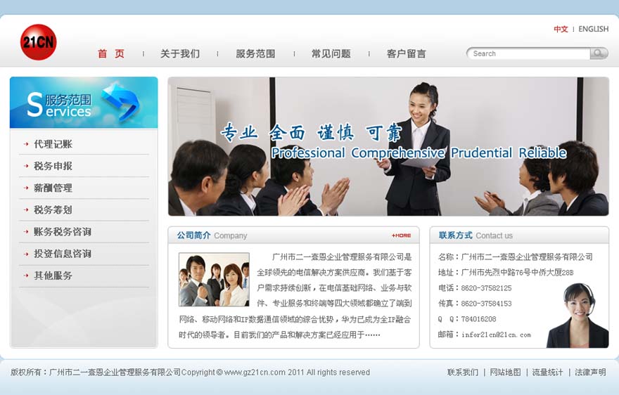 项目名称:广州市二一熹恩企业管理服务有限公司网站建设签定日期:2011年1月28日公司简介:广州市二一熹恩企业管理服务有限公司是一家为中国和外国客户提供各种财税服务的专业咨询公司。我们的团队均由在财务、税务、企业管理咨询等领域从业多年并拥有