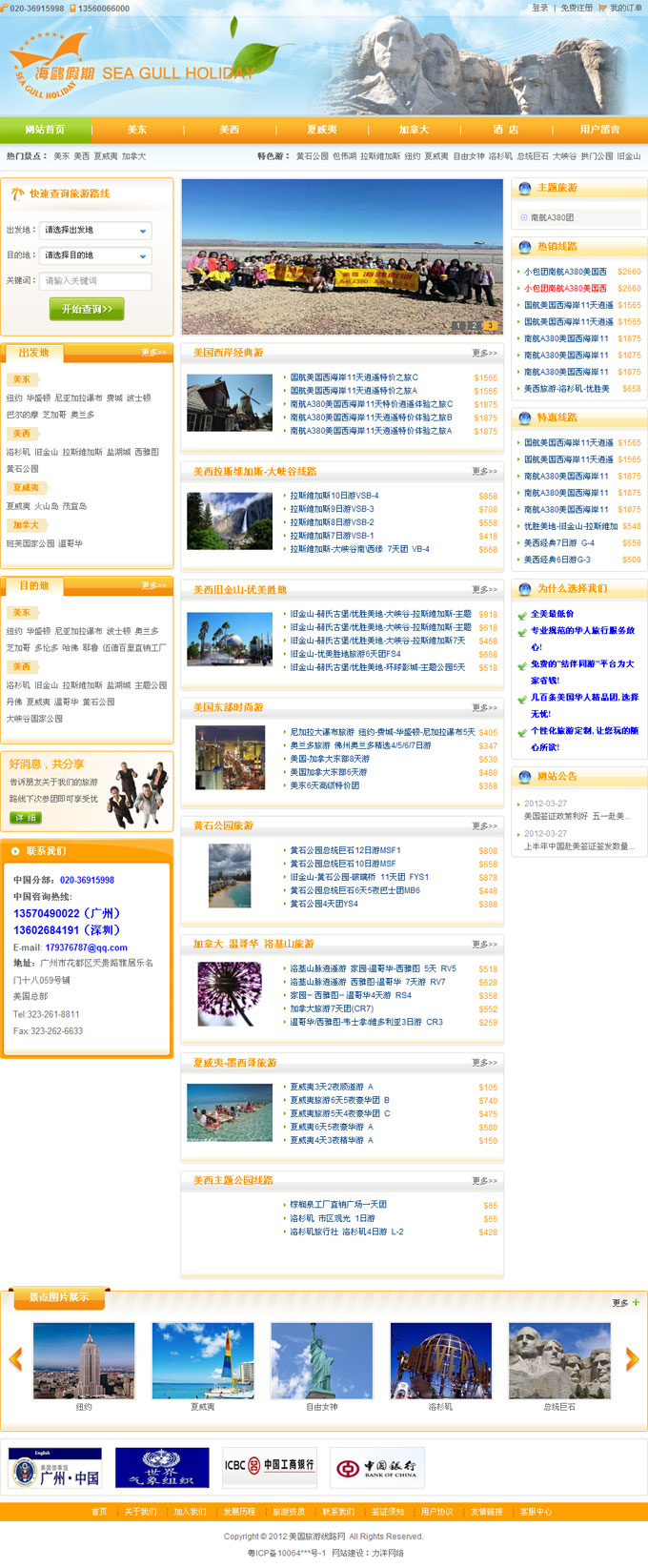 项目名称:美国海鸥旅游集团公司网站建设签定日期:2012年3月2日网址:http://www.haiouholiday.com  美国海鸥旅游集团公司是一家集旅游产品批发、散客/团体接待和巴士租赁业务于一身的大规模集团公司,总部设在美国洛杉