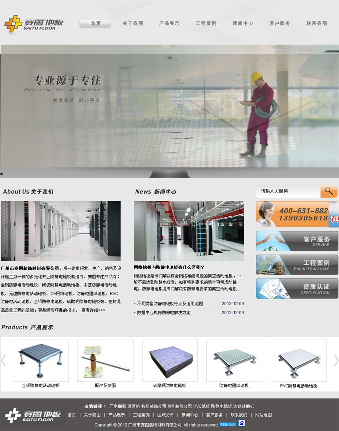 项目名称:广州市赛图装饰材料有限公司网站建设签定日期:2012年5月23日网址:http://www.gzsaitu.com  广州市赛图装饰材料有限公司,系一家集研发、生产、销售及设计施工为一体的多元化专业防静电地板制造商。赛图专注产品有
