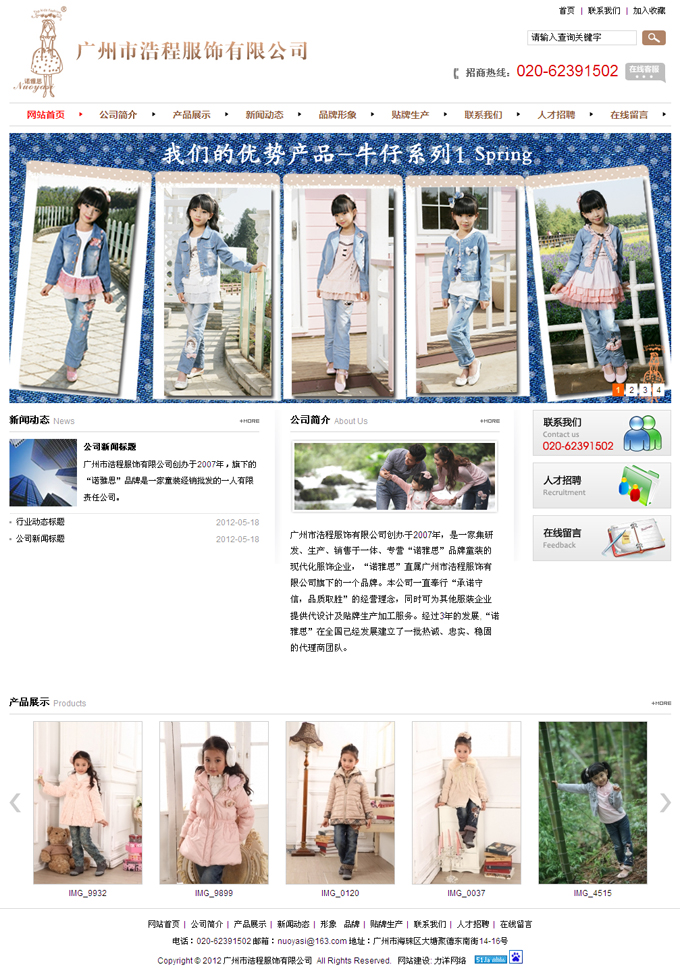 项目名称:广州市浩程服饰有限公司网站建设签定日期:2012年8月20日网址:http://www.nuoyasi.com.cn/广州市浩程服饰有限公司创办于2007年,是一家集研发、生产、销售于一体、专营“诺雅思”品