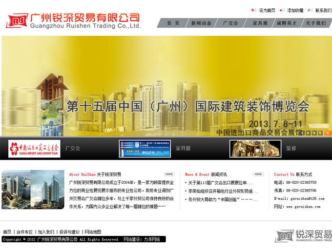 项目名称:广州锐深贸易有限公司网站建设签定日期:2012年11月22日网址:http://www.gzruishen.com广州锐深贸易有限公司成立于2004年,是一家为顾客提供全方位的商业性展览展示服务的专业性公司。我司专业调剂广州交易会