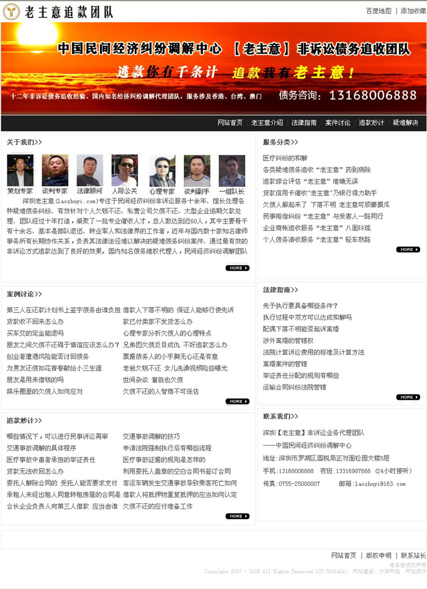项目名称:追帐公司网站建设签定日期:2013年5月9日网址:http://www.laozhuyi.com深圳老主意专注于民间经济纠纷非诉讼服务十余年、擅长处理各种疑难债务纠纷、有效针对个人、私营公司、大型企业债权债务处理、团队经过十年打造