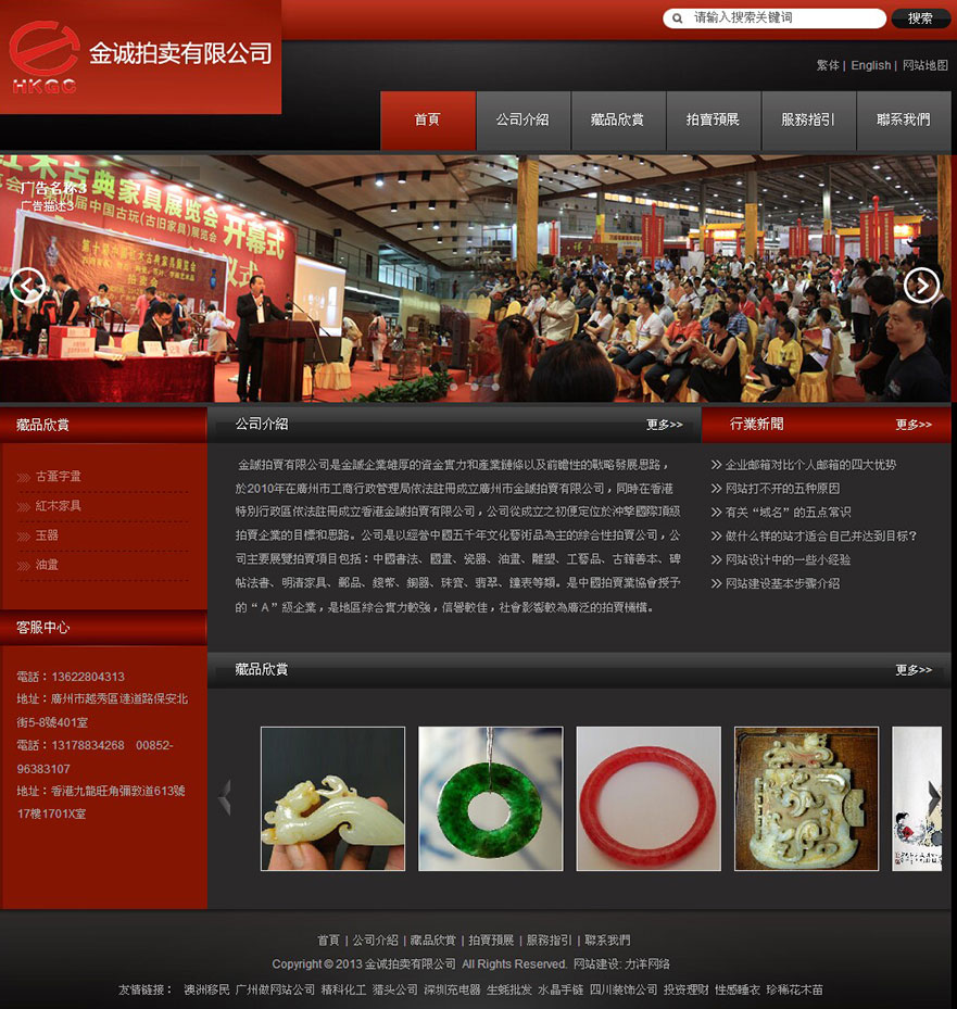 项目名称:金誠拍賣有限公司网站建设签定日期:2013年6月3日网址:http://www.hkgc88.com金誠拍賣有限公司是金誠企業雄厚的資金實力和產業鏈條以及前瞻性的戰略發展思路,於2010年在廣州市工商行政管理局依法註冊成立廣州市金