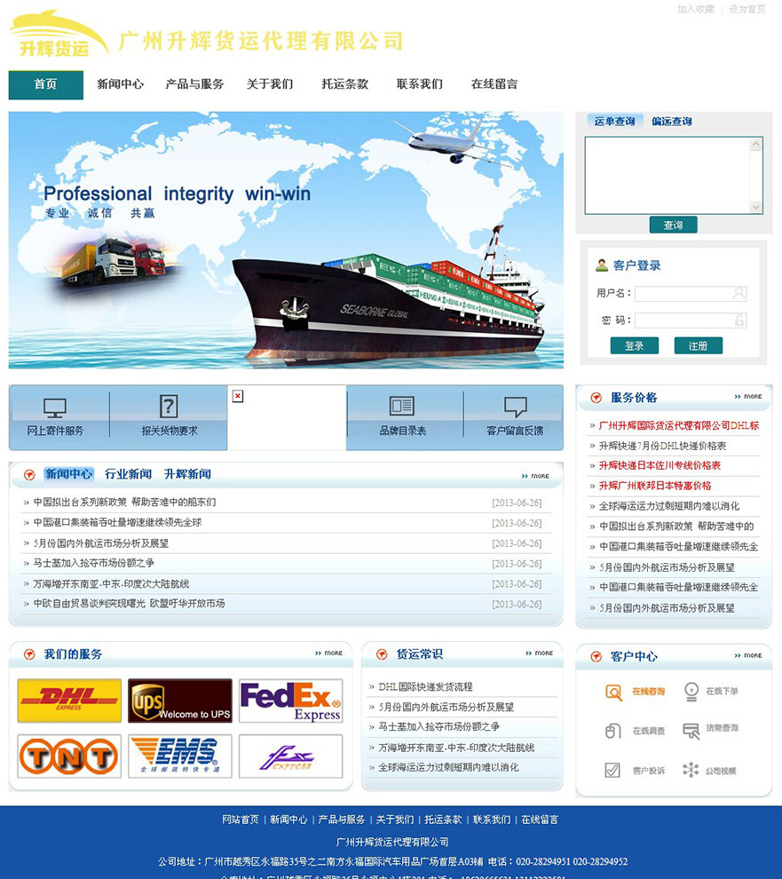 公司开设有国际货运、国际速递(DHL、UPS、FEDEX、TNT、EMS)等经营项目,始终以“高效、快捷、准时、安全”为企业服务宗旨,以“优质为本、信誉为魂”,以“想客户之所想,急客户之所急”为企业精神,致力于发展成为国际贸易及第三方物流的一体化供应商,为进入中国市场的国际产品搭建全方位的服务平台。您只需一个电话或一份传真,就由我公司专业人员,以低成本、高效率、根据您的具体要求来完成,并能让客户及时获得货物的最新转运信息,解除您后顾之忧。选择我们,让我们以合理的价格,良好的信誉为您提供最优质的服务。