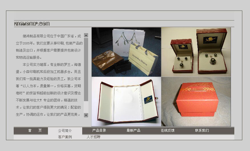 项目名称:建鸿制品有限公司网站建设签定日期:2013年6月19日网址:http://www.kinghomep.com健鸿制品有限公司位于中国广东省,成立于2005年。我们主要从事印刷,包装产品的制造及出口,并根据客户需要提供包装设计和物流